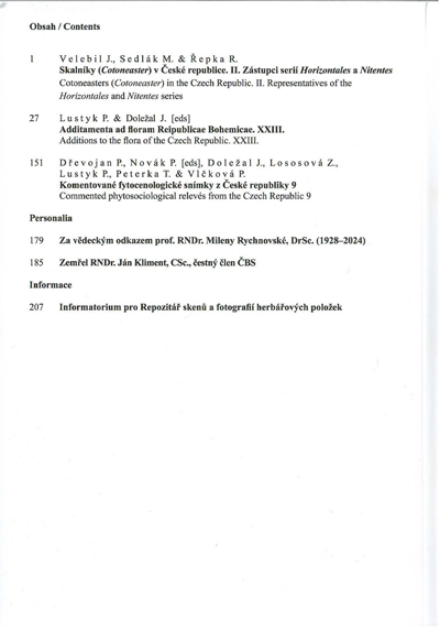 Pro praktickou terénní botaniku je však podnětný příspěvek autorů Velebil, Sedlák a Řepka o skalnících (Cotoneaster) v České republice, tentokrát o zástupcích sérií Horizontales a Nitentes. Najdeme zde také XXIII. díl Dodatků k flóře České republiky (Additamenta ad floram Reipublicae Bohemicae) i s některými příspěvky členů Moravskoslezské pobočky či regionálními údaji. Zájemci o fytocenologii jistě uvítají Komentované fytocenologické snímky z České republiky 9.